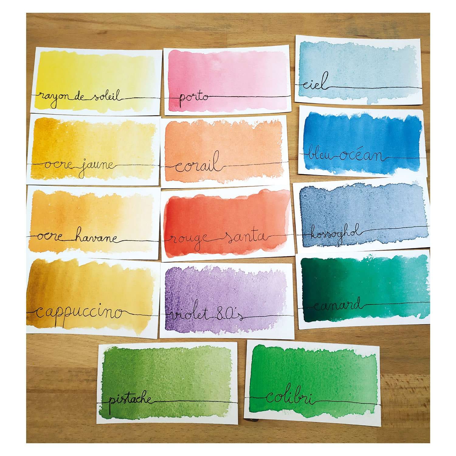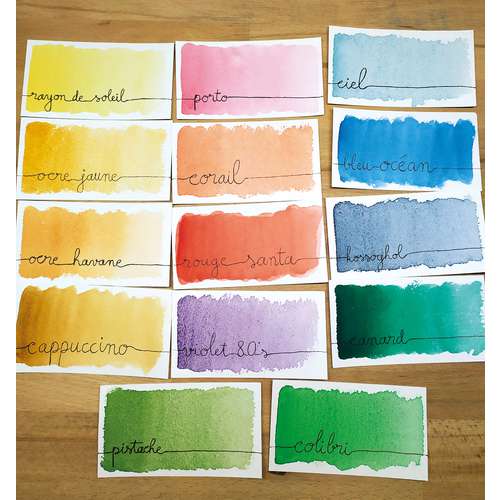 - Exploration (14 halbe Näpfchen): Sunbeam, Yellow Ochre, Havana Ochre, Cappuccino, Porto, Coral, Santa Red, 80s Violet, Pistachio, Hummingbird, Sky, Ocean Blue, Hossoghol, Duck