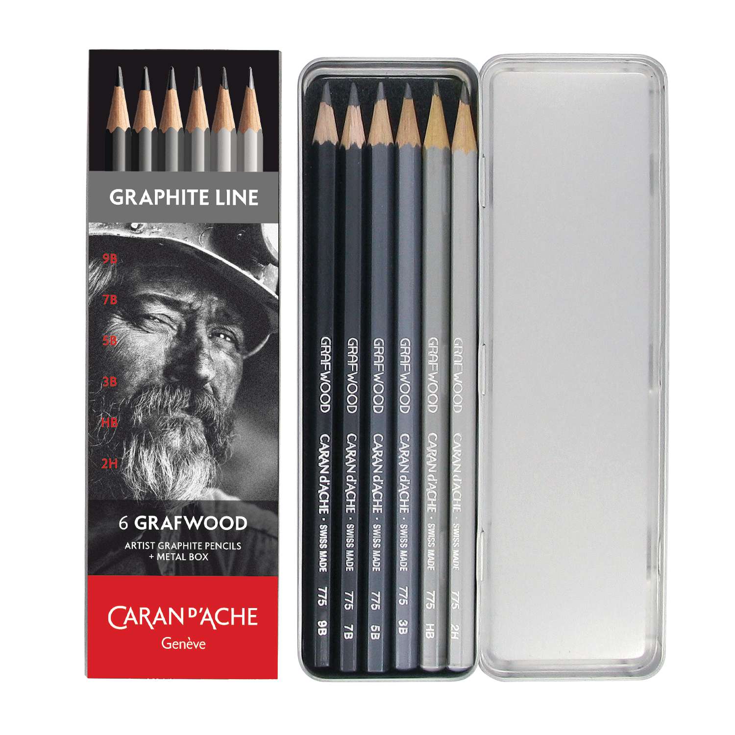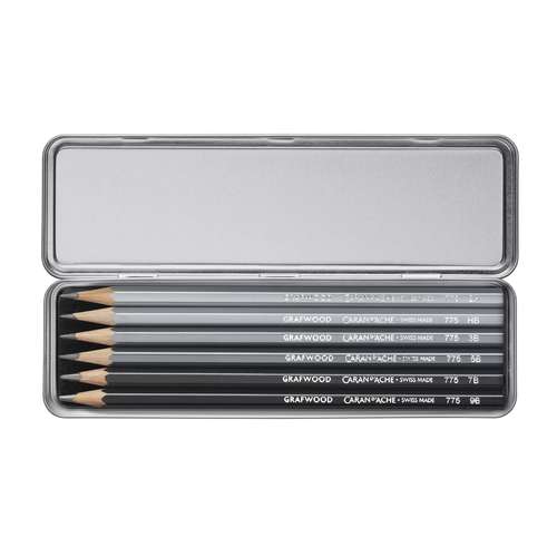 Das CARAN D'ACHE® GRAPHITE LINE-Set enthält 6 x GRAFWOOD Stifte. Abgestufte Schwarztöne für Profis mit verschiedenen Härtegraden, von fest bis weich. Die Stifte bieten die gesamte Palette der Graphitminen. Auf dem Lack der Stifte sind der genaue Härtegrad und der Schwarzton angegeben.