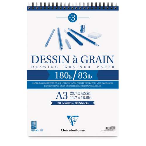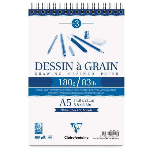 Der Clairefontaine "Dessin à Grain" Spiralblock enthält säurefreies, licht- und alterungsbeständiges Papier. Das Papier hat eine raue und eine glatte Seite. Die raue Seite ist ideal geeignet für Trocken-Techniken, wie Bleistift, Pastell, Tusche und Zeichenkohle.