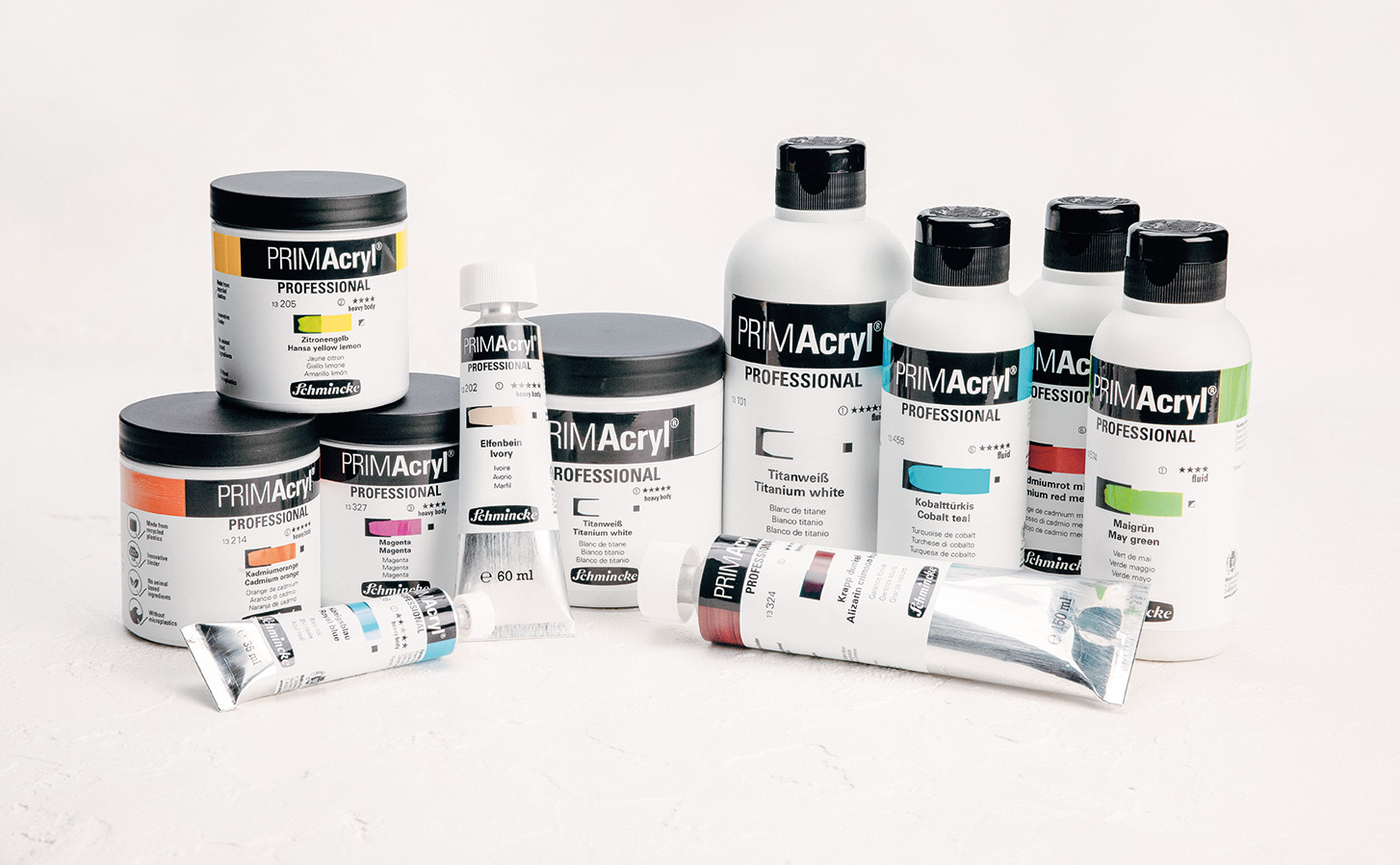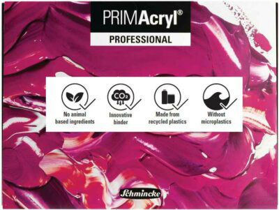 Es ist Schmincke gelungen, die neue PRIMAcryl Professional umweltschonend und mit einem Bindemittel ohne Mikroplastik zu rezeptieren. Das eingesetzte Bindemittel wird nachhaltig hergestellt: Es wird nicht aus Erdöl gewonnen, sondern nahezu vollständig aus „End-of-use“-Kunststoffen (z. B. alten Autoreifen) oder Pflanzenresten produziert.
