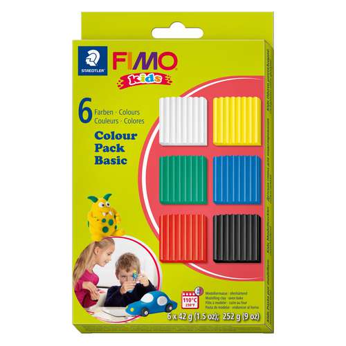 FIMO® Kids Colour Pack "Basic" enthält 6 Blöcke Modelliermasse in den Basisfarbtönen Weiß, Gelb, Rot, Blau, Grün und Schwarz. FIMO® Kids wurde speziell für Kinder entwickelt, ist sehr weich und fördert Feinmotorik und Kreativität.