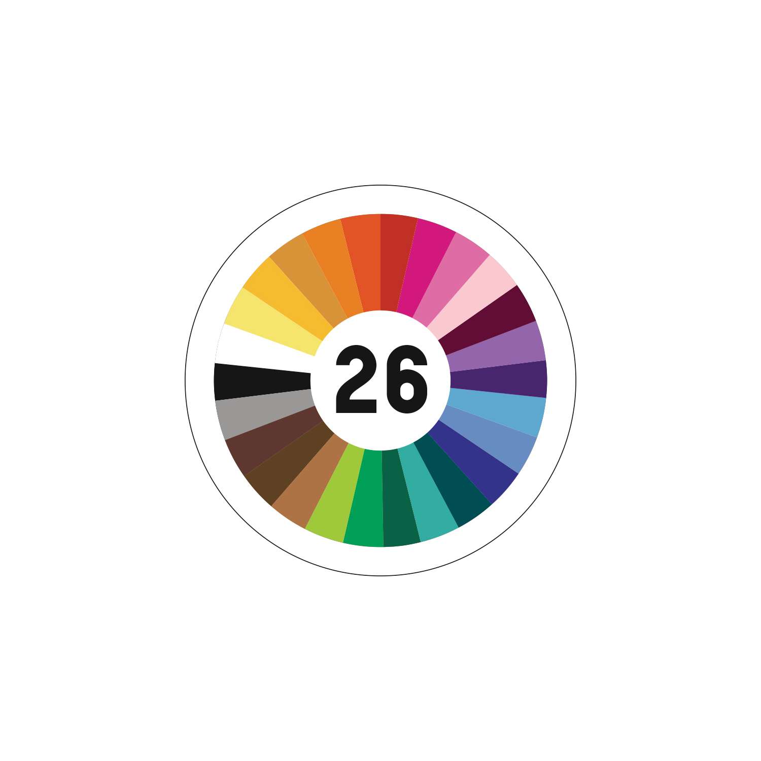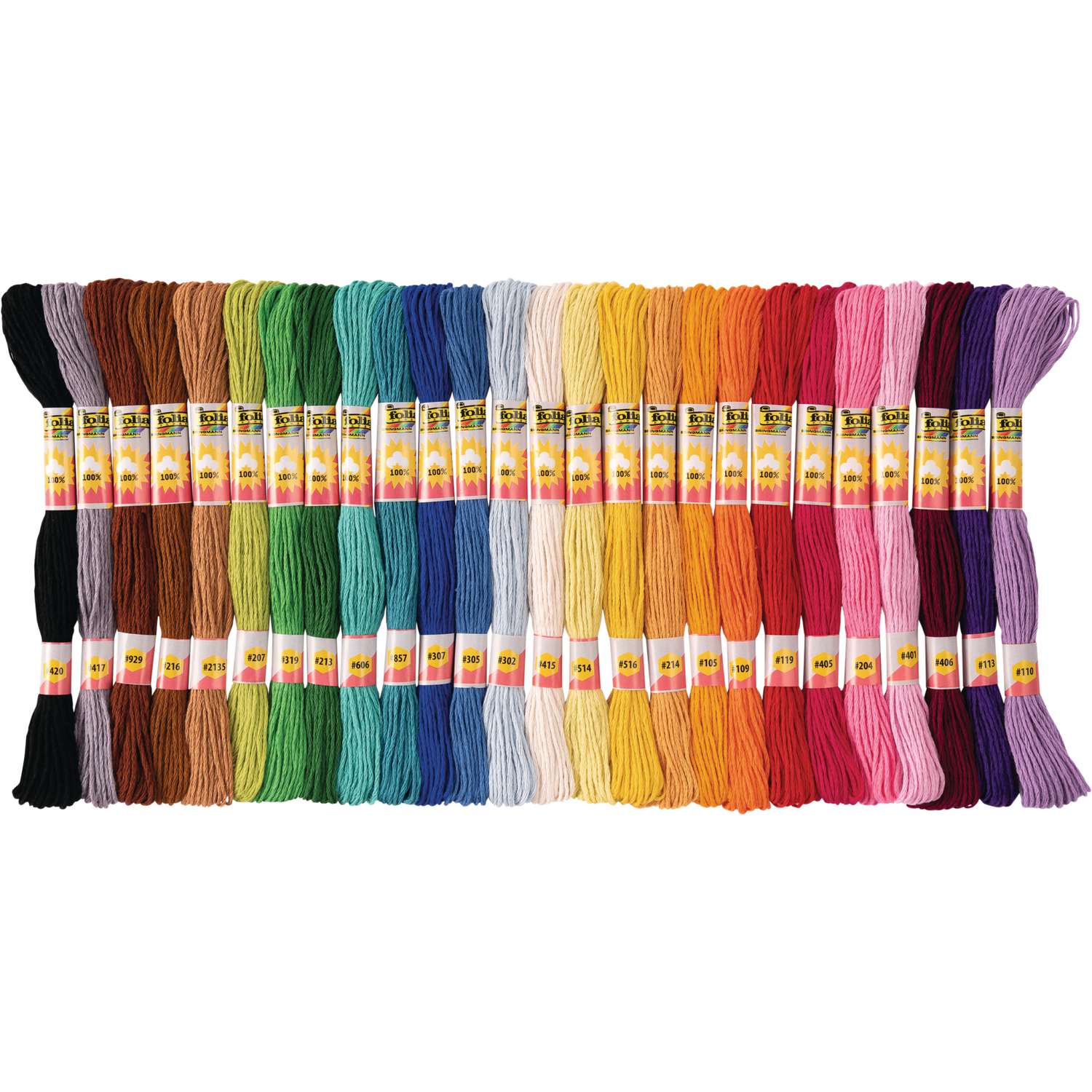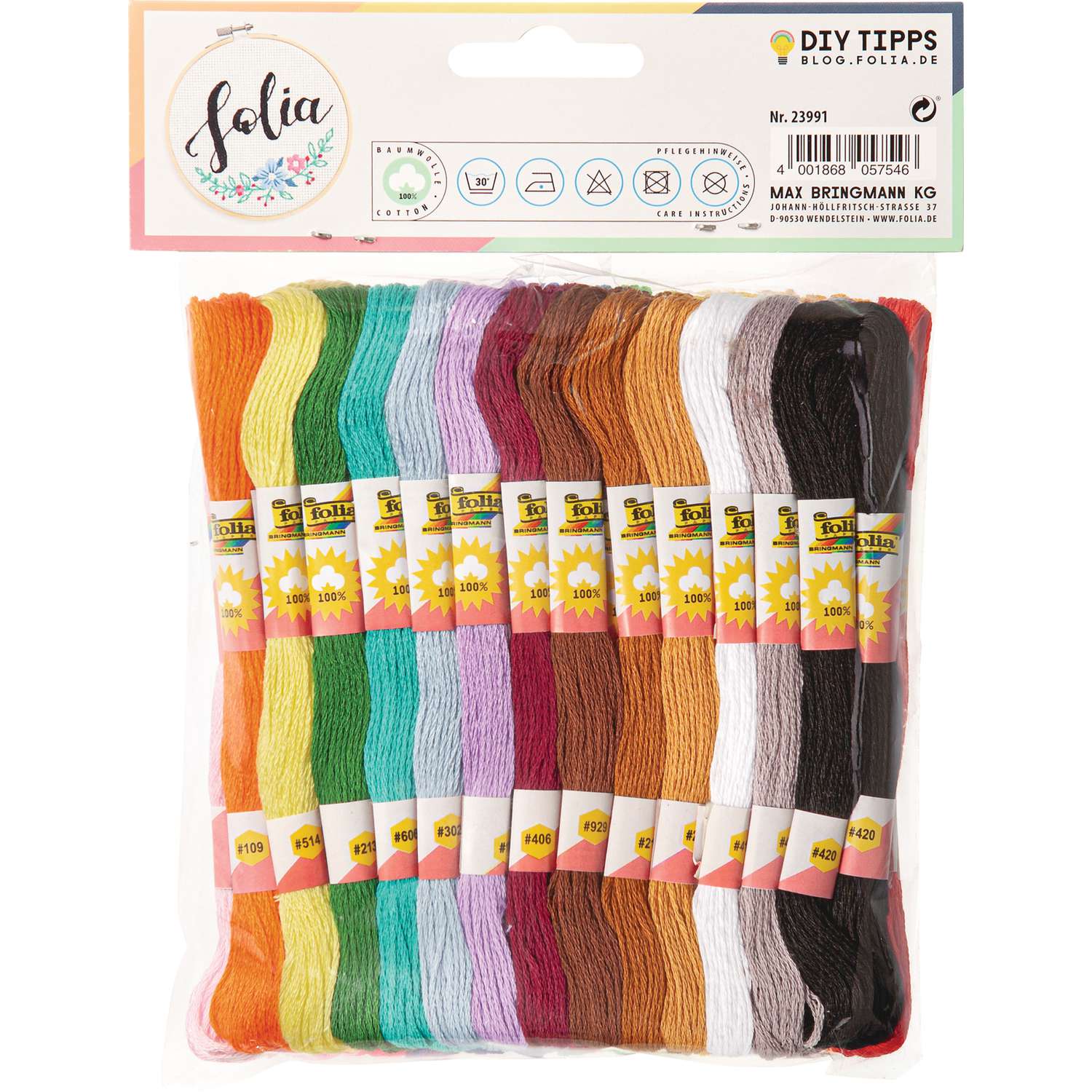 folia® Stickgarn in der Packung mit insgesamt 416 m Garn in 26 Farben.
