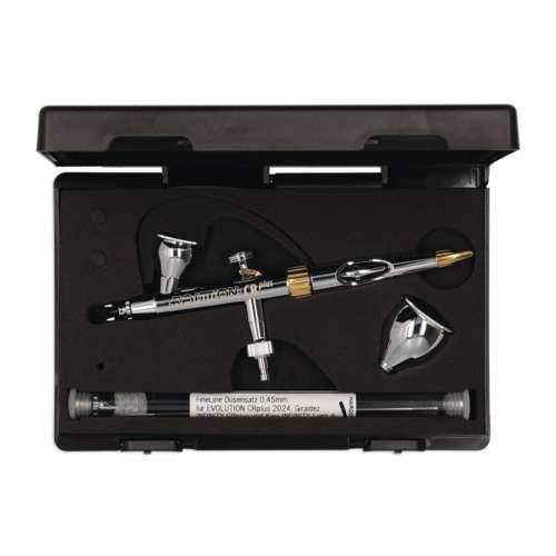 Die Evolution CRplus 2024 setzt neue Maßstäbe: Noch nie bot eine Airbrush in dieser Klasse so viel Leistung und Ausstattung. Jede Komponente wurde von Grund auf neu konzipiert, wobei die bewährten Merkmale der Evolution-Serie erhalten blieben, die sie seit jeher so beliebt machen. Das neue Modell ermöglicht längeres, komfortableres und präziseres Arbeiten – egal, ob Sie detailreiche Kunstwerke schaffen oder großflächige Projekte umsetzen. Benutzerfreundlichkeit und Effizienz stehen dabei ebenso im Fokus wie die Förderung Ihrer Kreativität.Neben der Funktionalität überzeugt die Evolution CRplus 2024 auch durch ihr durchdachtes und hochwertiges Design – ein Arbeitsgerät, das leistungsstark und zuverlässig ist.