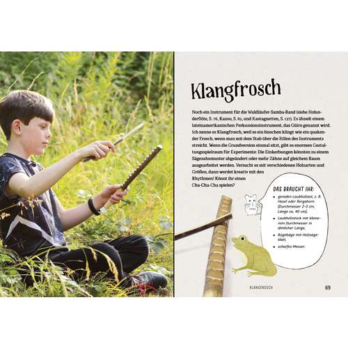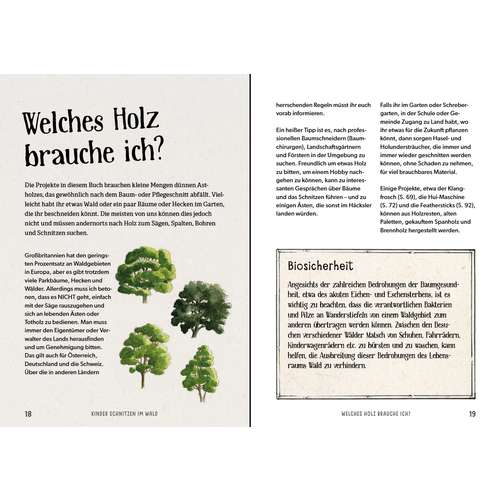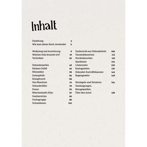 Mit den richtigen Vorlagen lassen sich schon die Jüngsten für das schöne alte Handwerk des Schnitzens begeistern. Das Buch präsentiert 20 einfache Projekte, die Kinder nachschnitzen können und an denen sie hinterher noch lange Freude haben werden: von der Hui-Maschine über lustige Instrumente wie eine Holunderpfeife, Kastagnetten, ein Kazoo und einen Klangfrosch sowie eine Fuchsfamilie, drollige Stockmännlein, Tannenbäumchen und eine Halskette bis hin zu einer Kartoffelkanone aus Holunderholz, die Kinder schon vor Jahrhunderten geschnitzt haben. Dabei liegt der Fokus stets auf sicherem und gutem Gelingen unter Erwachsenenaufsicht.