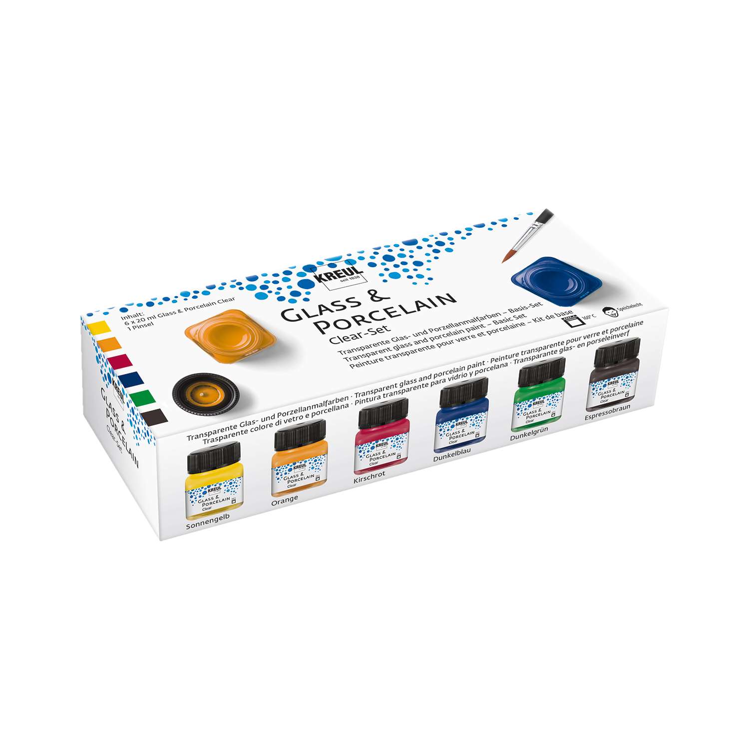Set aus sechs transparenten Glas- und Porzellanfarben inklusive Pinsel. Ideal zur Dekoration von glatten Oberflächen mit glänzendem Finish.
