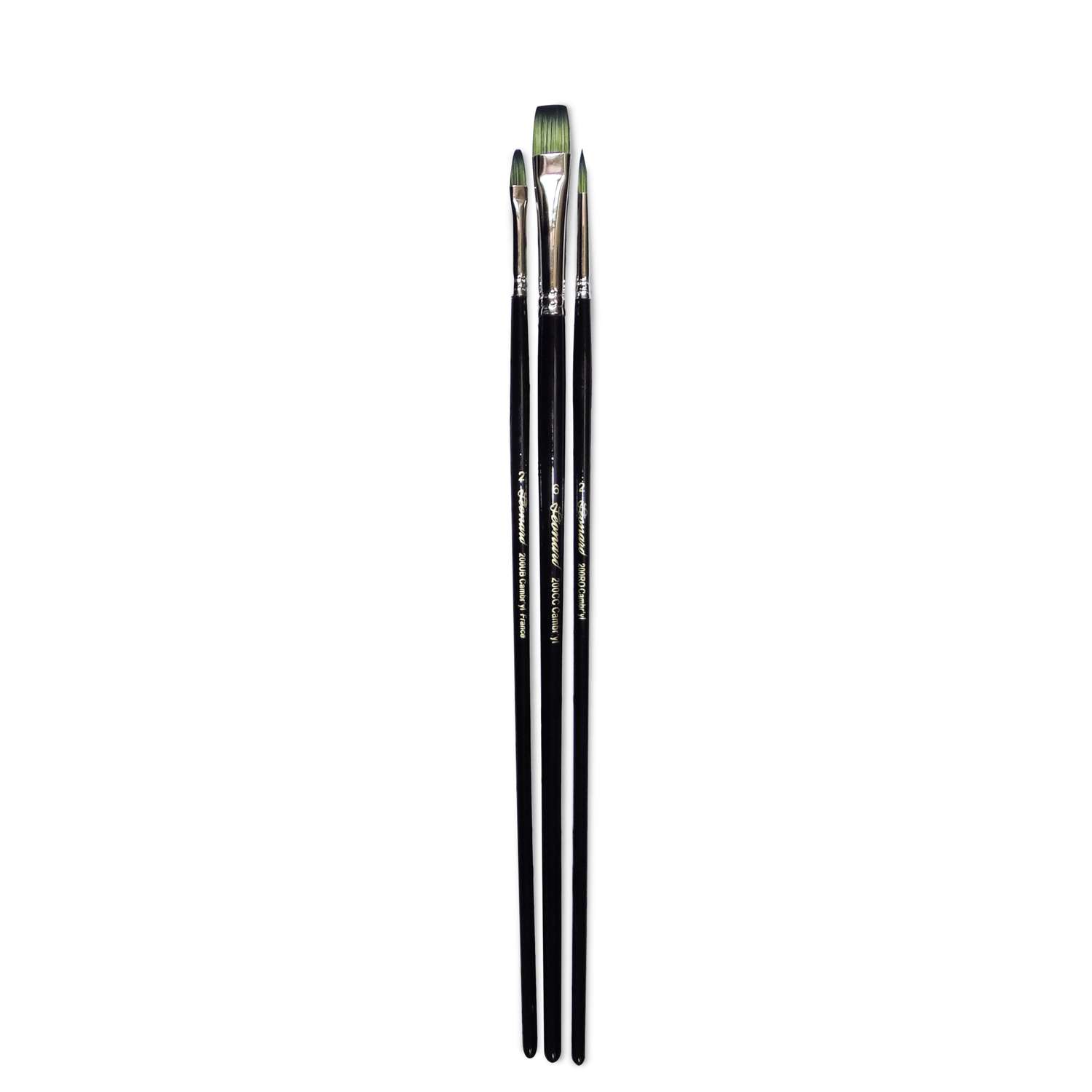 Das Léonard Pinselset CAMBRY'L besteht aus 3 Pinseln mit synthetischen Fasern in grün-bronzener Optik sowie gebogenen Borsten.