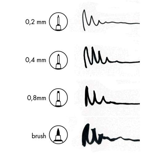 Marabu Fineliner Colour Graphix in kräftigem Schwarz durch hochwertige, lichtbeständige und geruchsarme, Pigmenttusche auf Wasserbasis. 4er-Set in den Strichstärken 0,2 mm, 0,4 mm, 0,8 mm, Brush-Spitze.