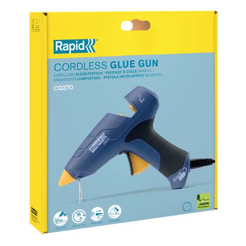 Die Rapid® CG270 Heißklebepistole ist eine vielseitige Lösung für Klebearbeiten im Innen- und Außenbereich. Sie unterstützt Klebesticks mit einem Stabdurchmesser von d 12 mm und bietet eine hohe Kleberfördermenge für effizientes Arbeiten. Dank des abnehmbaren Kabels können Sie bis zu 7 Minuten kabellos arbeiten, was einen besonders flexiblen Einsatz ermöglicht. Die Pistole hat eine Aufwärmzeit von etwa 3 Minuten und eine Leistung von 250 W. Sie misst eine Breite von 195 mm, eine Höhe von 177 mm und eine Tiefe von 46 mm und wiegt ca. 0,34 kg.