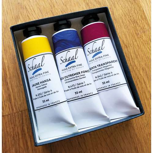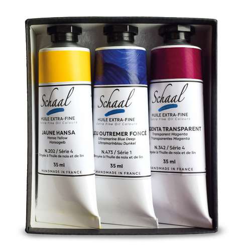 Schaal extrafeine Ölfarbe im 3er-Set: Hochwertige, handgemachte Künstlerfarben mit intensiver Leuchtkraft in den Tönen Hansa-Gelb, Ultramarinblau und Transparent-Magenta.