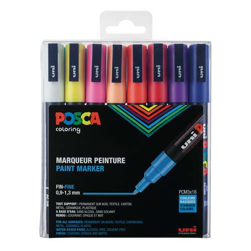 Die UNI POSCA Marker PC-3M im Set überzeugen durch hohe Deckkraft und Lichtbeständigkeit. Sie sind hervorragend für jede Oberfläche. Die Farbe haftet dauerhaft und wasserfest auf rauen Oberflächen. Hingegen auf glatten Oberflächen, wie Glas mit einem feuchten Tuch abwischbar. Keine Durchschrift bei Papier. Ebenfalls kinderfreundlich, da auf Wasserbasis, geruchlos und ohne Alkohol oder Lösungsmittel.