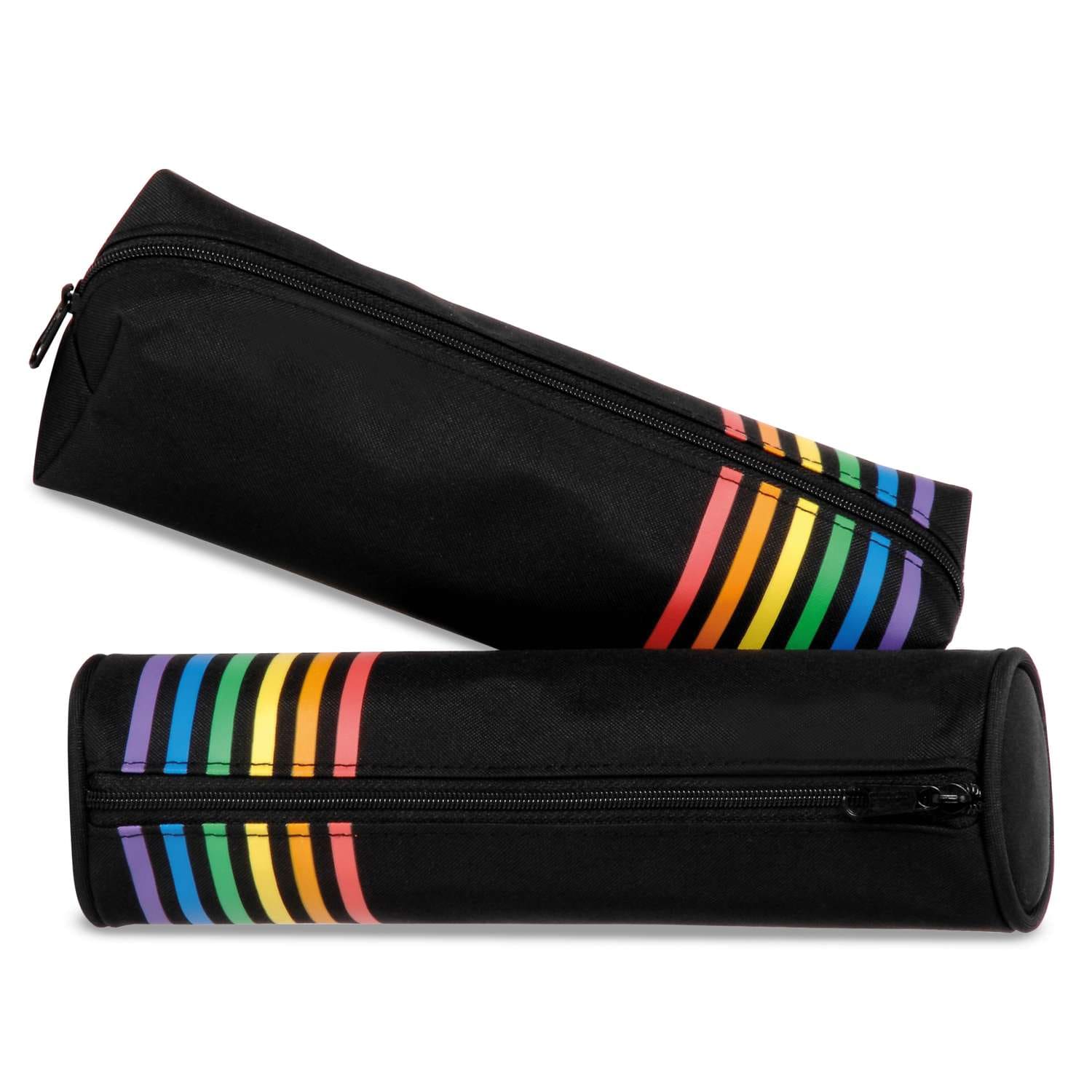 Das VIQUEL Rainbow Class Federmäppchen überzeugt mit schlichtem, funktionalem Design. Es besteht aus schwarzem 300D Polyester mit einem farbenfrohen Streifenmuster und bietet in einem Reißverschlussfach ausreichend Platz für Stifte und Zeichenutensilien. Die Form - rund oder rechteckig - wird nach dem Zufallsprinzip vergeben.