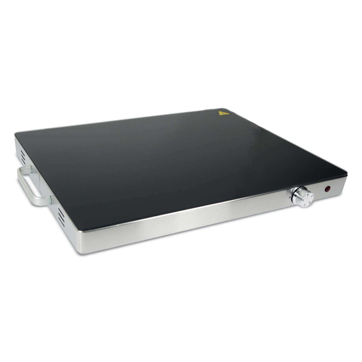 Cool-Touch-Griffe aus Aluminium sorgen für sicheren Halt und komfortables Handling. Die Warmhaltefläche aus gehärtetem Glas ist besonders robust und trägt bis zu 25 kg Gewicht. Der Rahmen besteht aus gebürstetem 430er Edelstahl, das Heizrohr aus 201er Edelstahl. Ein integrierter Überhitzungsschutz begrenzt die Glasoberfläche auf maximal 230 °C.