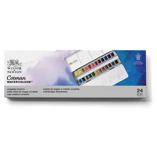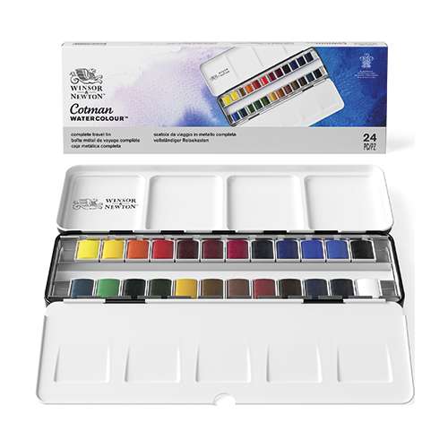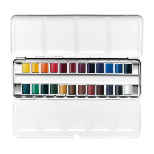 Dieser leichte Metallkasten ist ideal für Künstler und Hobby-Maler. Er enthält 24 sorgfältig ausgewählte Cotman™Aquarellfarben in halben Näpfchen sowie eine Farbkarte mit Anleitung. Die Box verfügt über eine integrierte Mischpalette im Deckel sowie eine ausklappbare Mischfläche, die das Anmischen von Farben erleichtert. Ein praktischer Daumenring an der Unterseite sorgt für sicheren Halt beim Malen. Zudem lässt sich das zentrale Farbfach herausnehmen, um zusätzlichen Platz für das Mischen zu schaffen. Nur solange der Vorrat reicht.